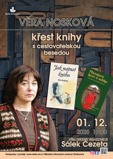 Věra Nosková uvede fotoshow z Tanzanie, která vznikla během dobrodružné výpravy se synem Tomášem a přítelkyní Martinou Gogaisslovou. Z této cesty vznikla kniha Masajové – krev a mlíko, zachycující nejen krásu africké přírody, ale i tvrdou realitu života místních lidí. Autoři přinášejí autentické svědectví o patriarchální společnosti kmene Masajů, o dětech žijících v chudobě i o lidskosti, která dokáže překlenout kontinenty.