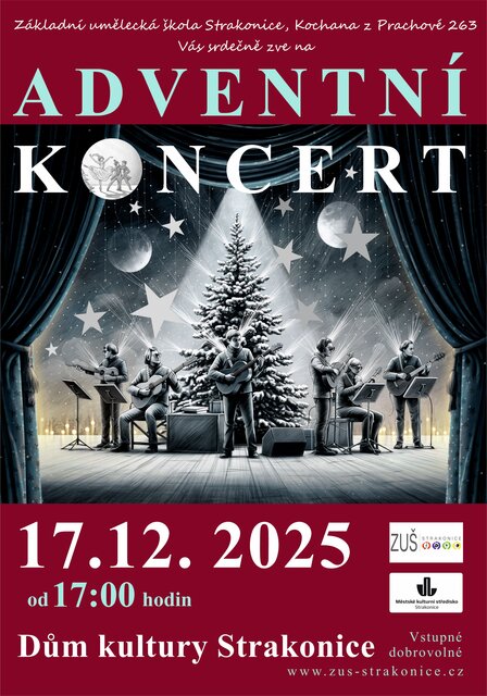 Srdečně zveme na tradiční Adventní koncert Základní umělecké školy Strakonice, který se uskuteční 17. prosince 2025 od 17:00 hod. v Domě kultury Strakonice. V předvánoční atmosféře se představí žáci hudebního a tanečního oboru, kteří připravili pestrý program plný klasické i moderní hudby, tanečních choreografií a sváteční nálady.