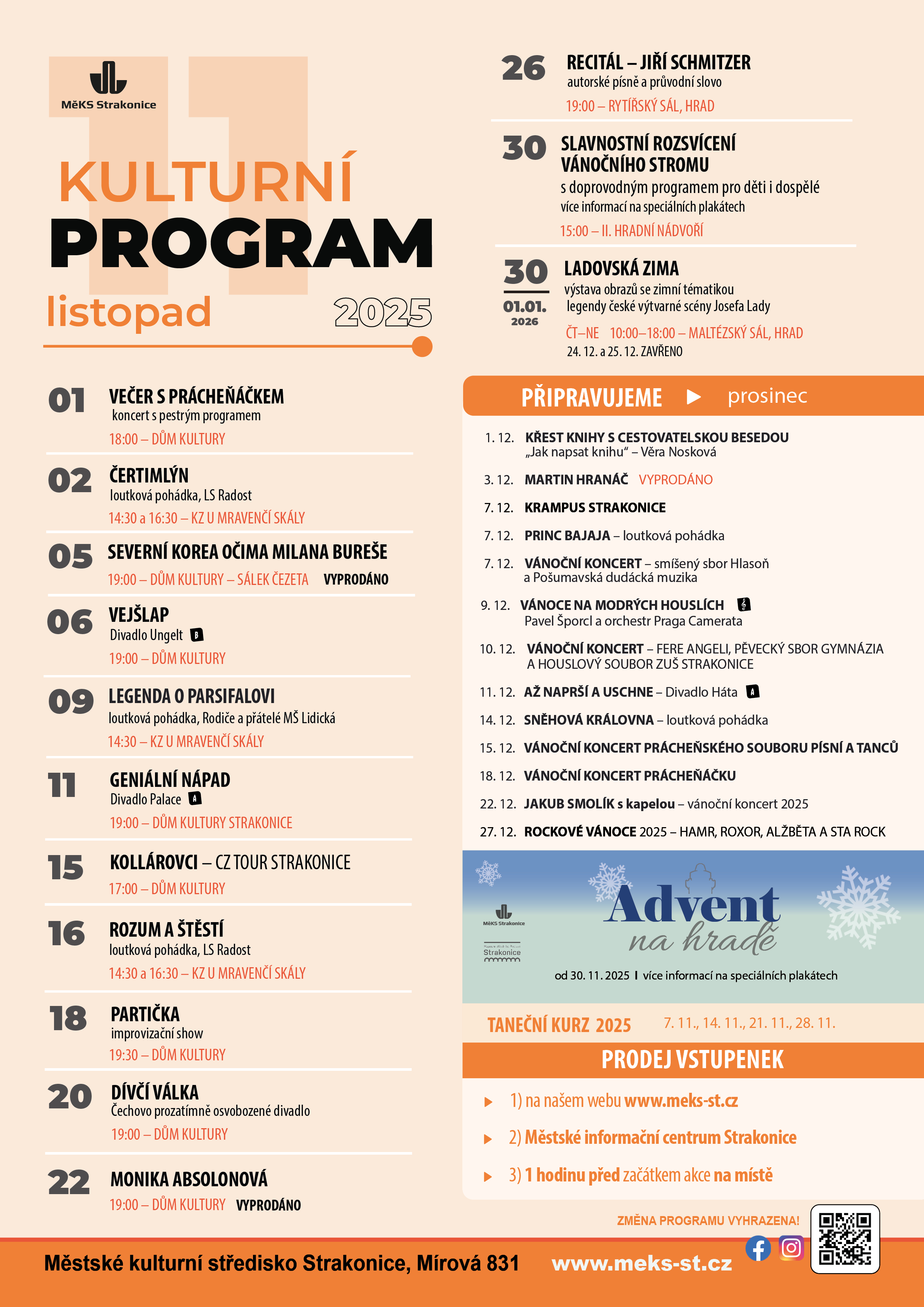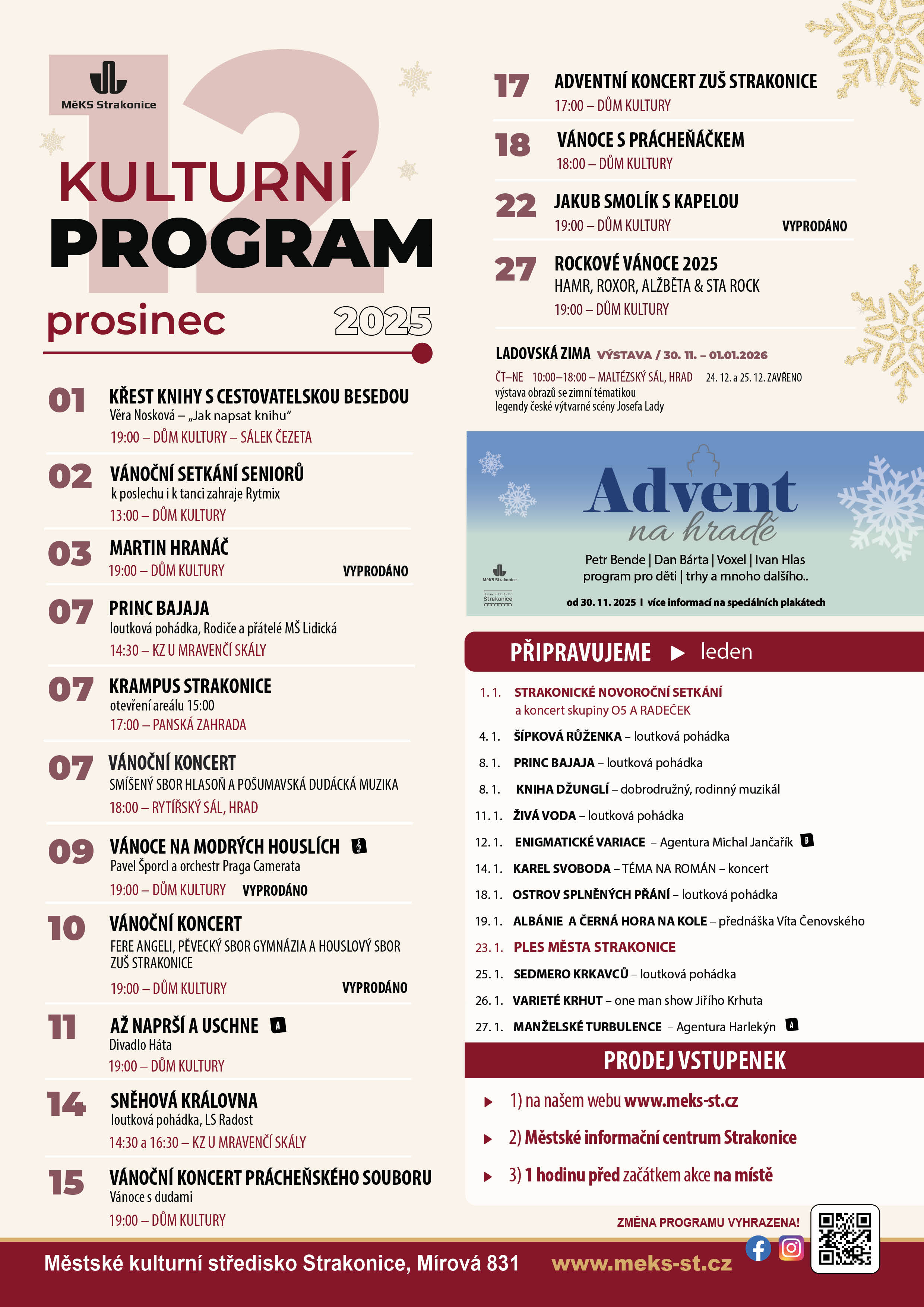Kompletní měsíční přehled jako brožura či A5 oboustranný leták (akce + kino) je dostupný v tištěné verzi v Mětském informačním centru na zámku, v domě kultury, v kině OKO, v galerii Maltézský sál - hrad Strakonice, na podatelně MÚ, v Infocentru pro seniory.